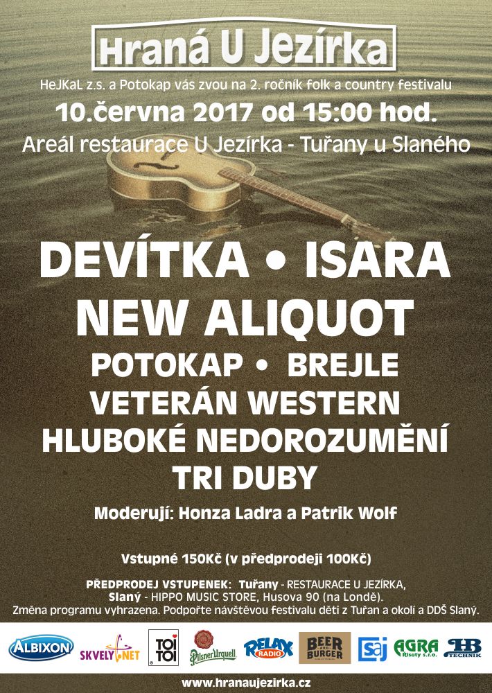 Hraná U Jezírka 201710. 6. 2017 od 15:00 hodinAreál restaurace U Jezírka – Tuřany u SlanéhoTri dubyHluboké nedorozuměníIsaraNew AliquotPotokapBrejleDevítkaVeterán WesternDalší informace: www.hranaujezirka.cz