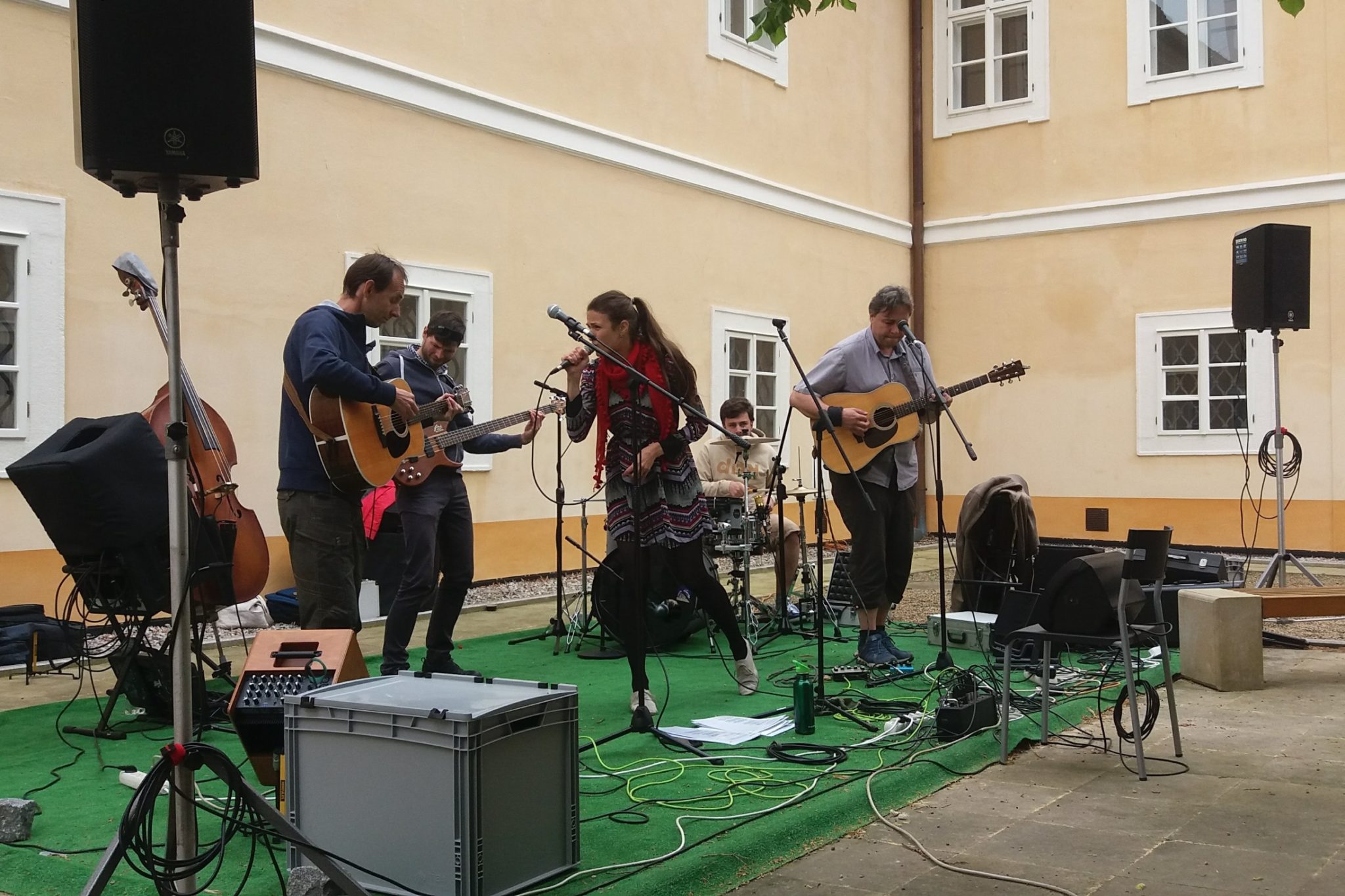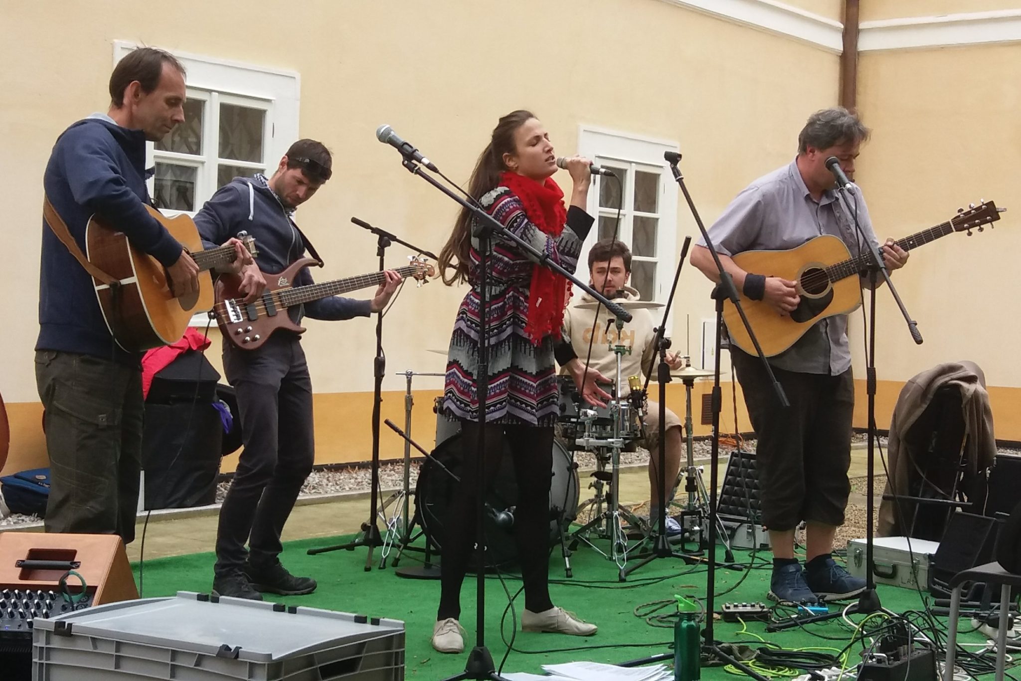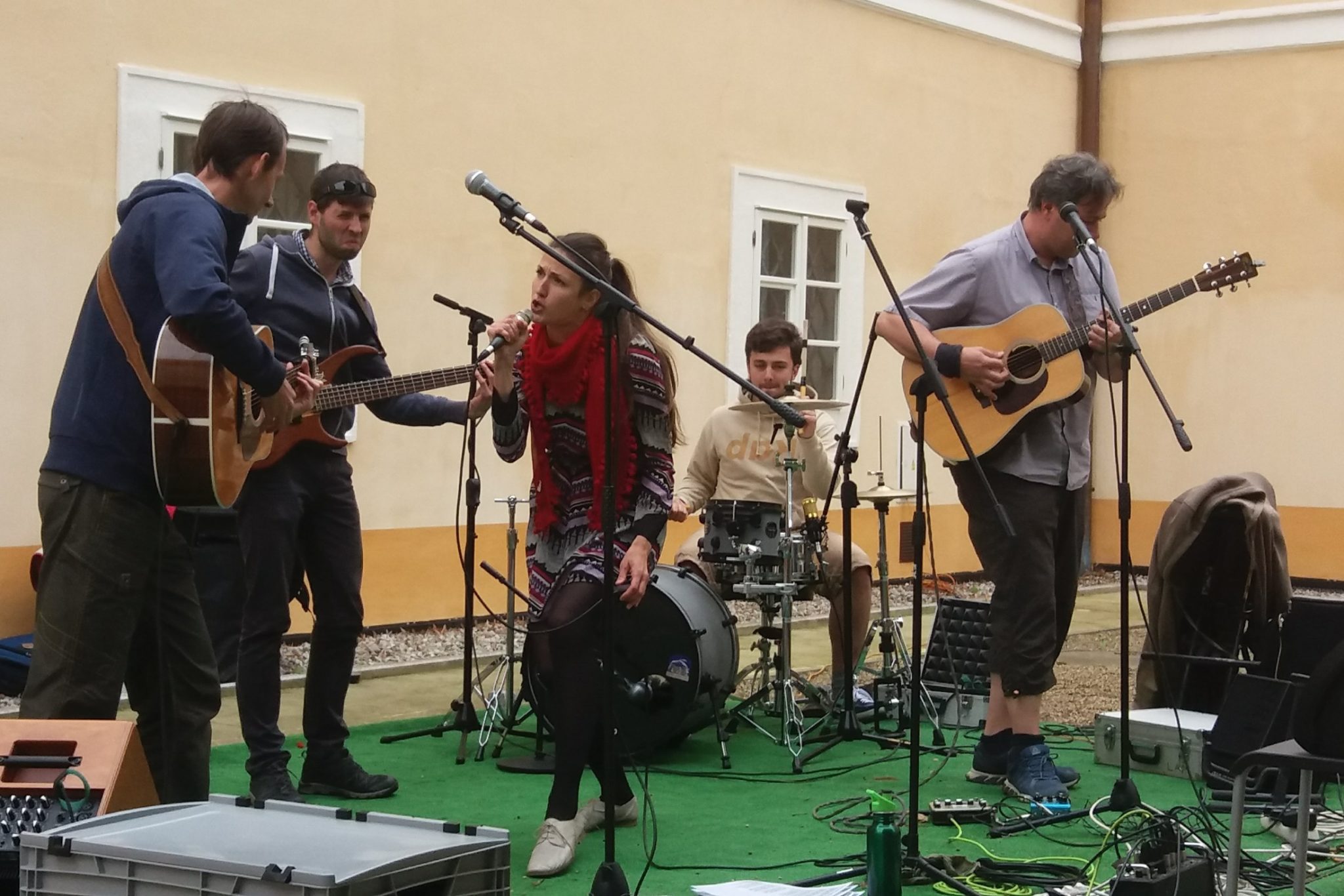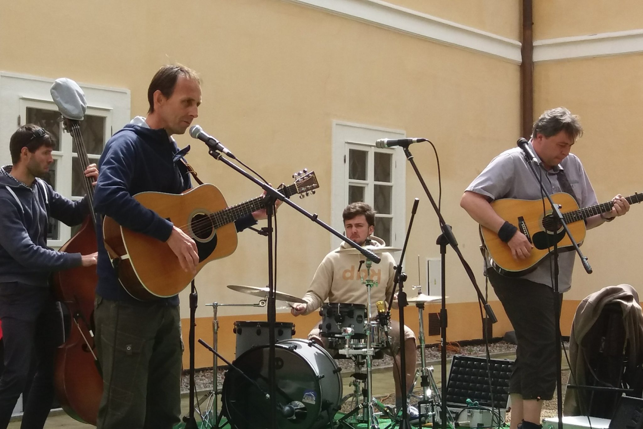 Zahajovali jsme totiž program na Zámku Valdštejnů v rámci velkolepé akce Valdštejnských slavností! Naším revírem bylo krásné nádvoří hned kousek od hlavního pódia. Narozdíl od běžného prvomájového postupu jsme však místo líbání pod rozkvetlou třešní rozeznívali libé tóny u galantní rozvětvené lípy, která celému prostoru statně dominovala. My jsme ji celkem zdárně svými vlastními dominantami (a subdominantami) sekundovali. Mezitím, co se zvučil Adam Mišík na „hlavní stejdži“, náš Mišik prováděl parádní výkon, jak je od něj posledních pár let zvykem. Měli jsme tu čest hrát před Stráníky s Mírou Ošancem, a bylo poznat, že lidé jsou připraveni hudbu nám vlastní poslouchat. Překvapilo nás, že dokázali ocenit nejen naše „tradičnější“ folkousky, ale také nedávno implementované moderní věci. Zkrátka koncík „parekselánc“, resp. pro někoho „párek-seanc“. I přes obavy nám nezapršelo, i přes obavy jsme nezkazili začátek 7. písně v pořadí, i přes obavy jsme nikoho nepřejeli, i přes obavy ovace dorazily. Co vám budeme povídat, je to radost. 🙂