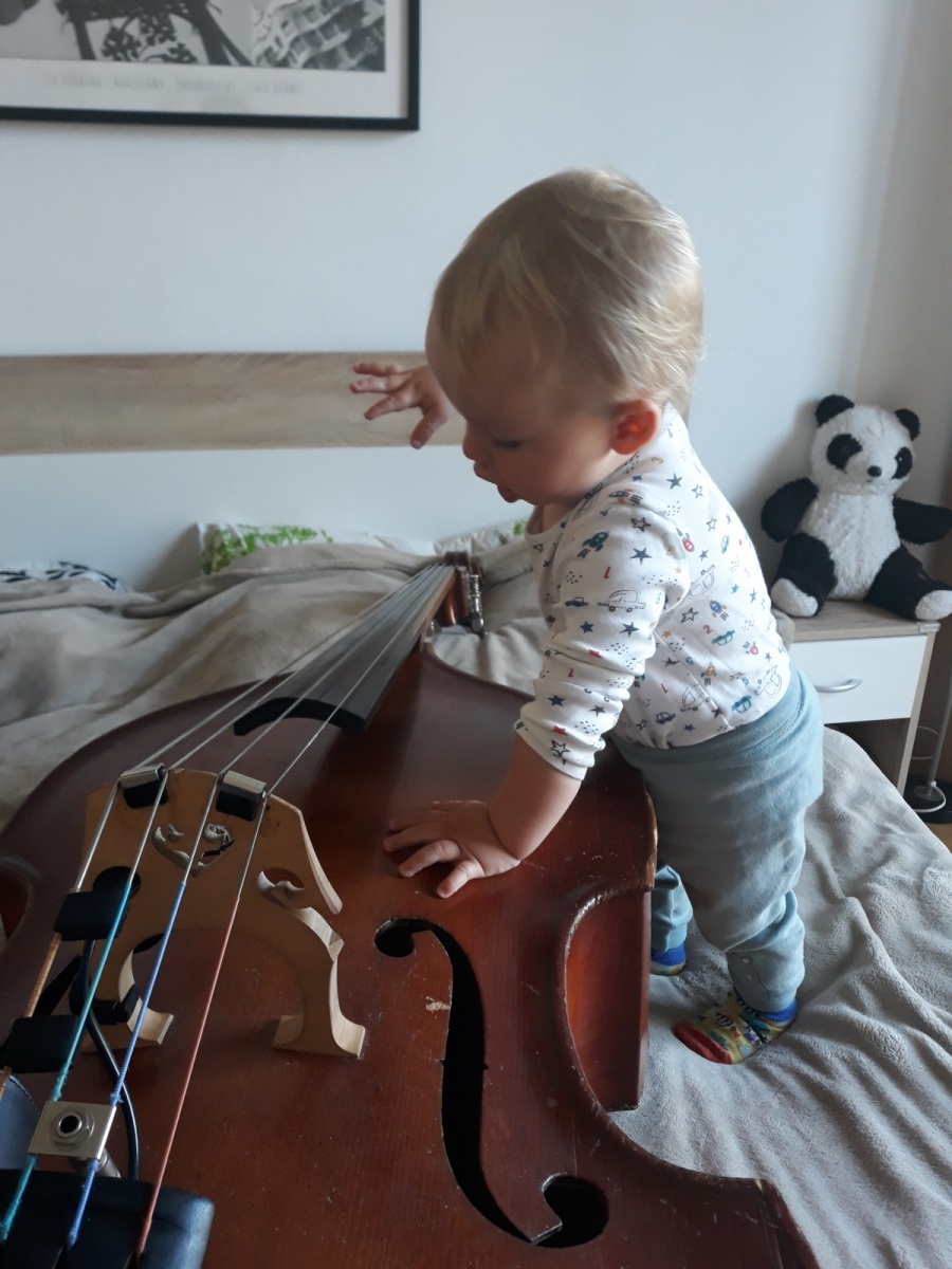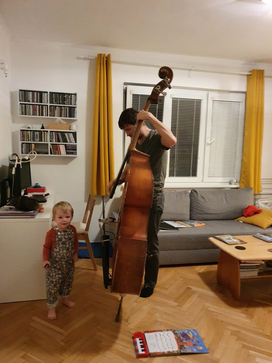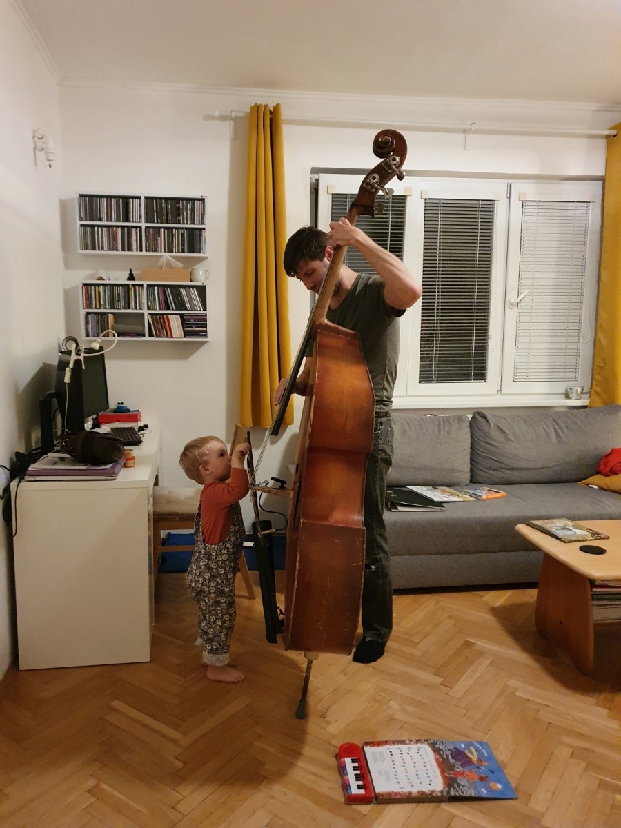 b) Výchova dětí za epidemického lockdownu rovněž otevře muzikantovi nebývalé obzory: např. pochopí, že cvičit na nástroj lze i doma v čase od jedenácté večerní do druhé hodiny po půlnoci, místo hraní na zkušebně, kterou měl před covidem cestou z práce, přicházel na ni před pátou podvečerní a opouštěl ji po deváté večerní a do které samozřejmě moc intenzivně nezajížděl, protože „neměl čas“ nebo „se mu zrovna nechtělo“. Rovněž si uvědomí, že kontrabas je sice hudební nástroj, ale nejlíp slouží za parádní silnici pro všechna možná autíčka, a že do efových otvorů ozvučné desky se nejlíp hážou hrací kostky, figurky nebo cokoliv, co lze otvory procpat dovnitř nástroje.
